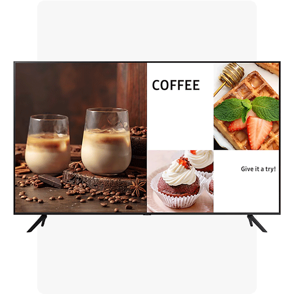 Pantalla profesional UHD de 75" con alto brillo, sistema Tizen y operación continua. Ideal para