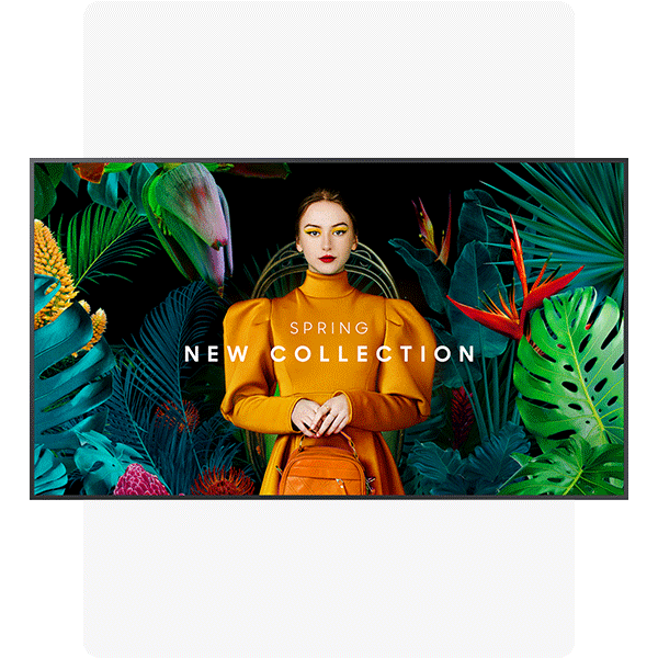 Monitor profesional de 55" con resolución UHD 4K, diseñado para señalización digital en comercios, salas